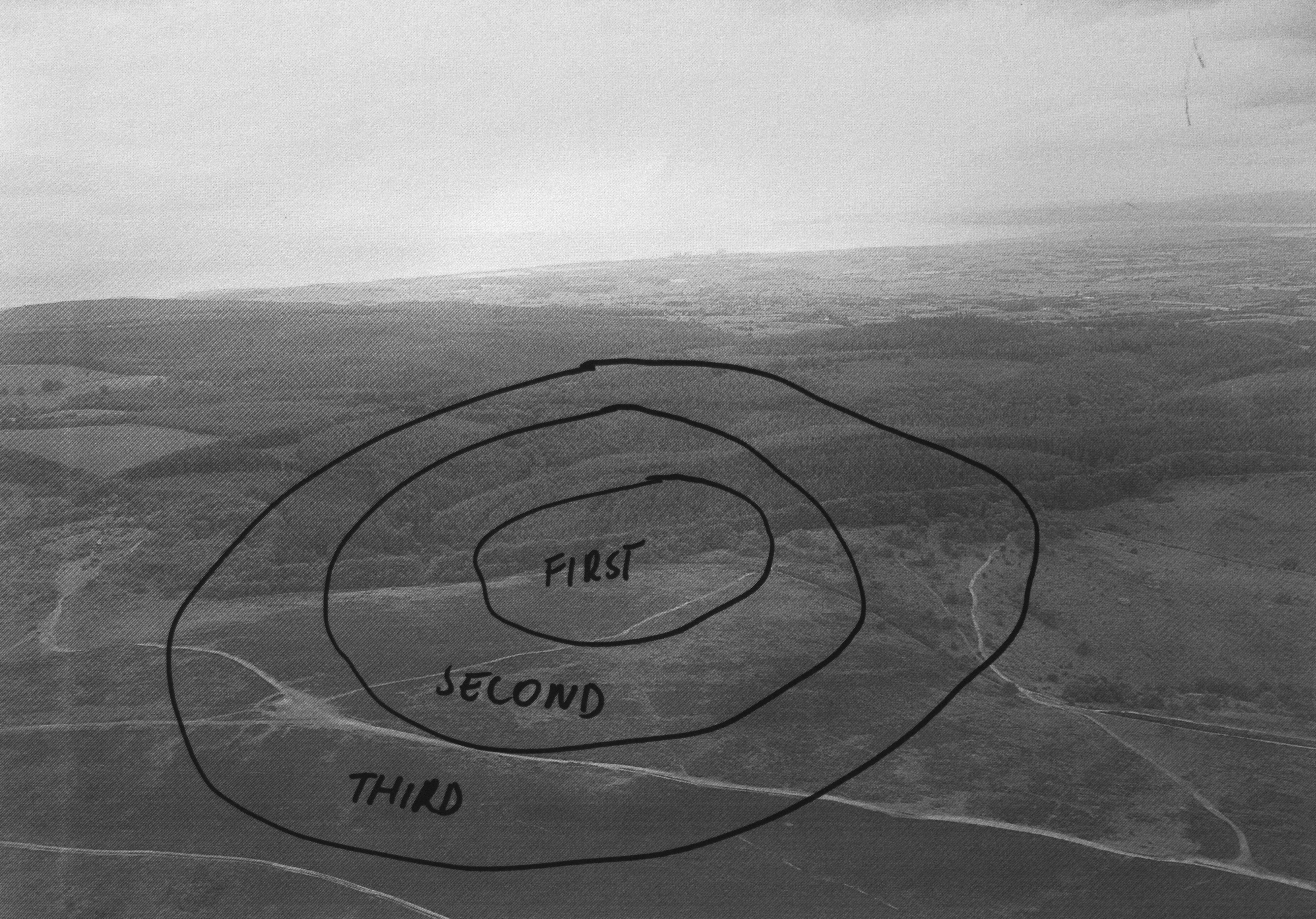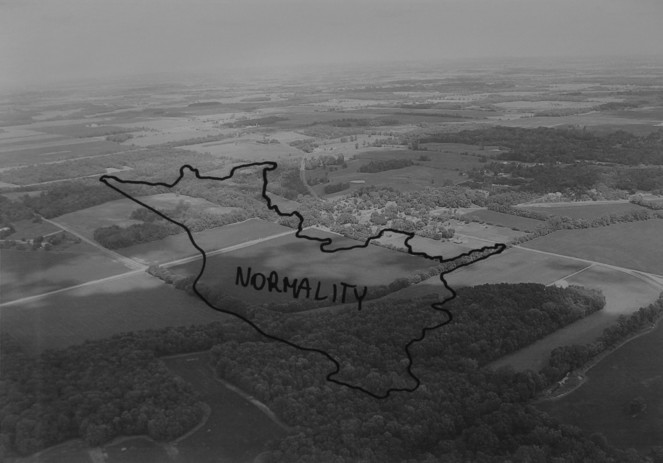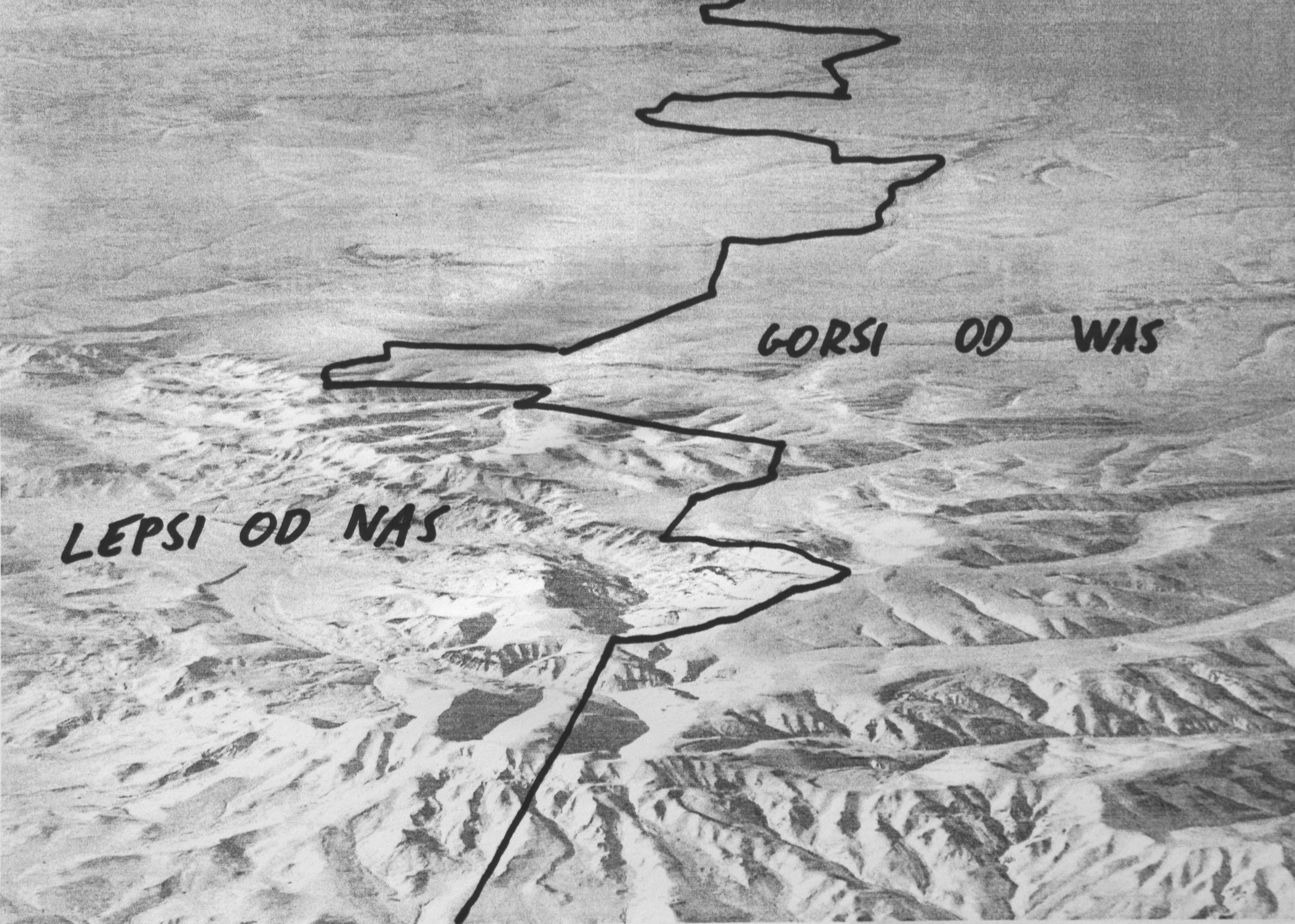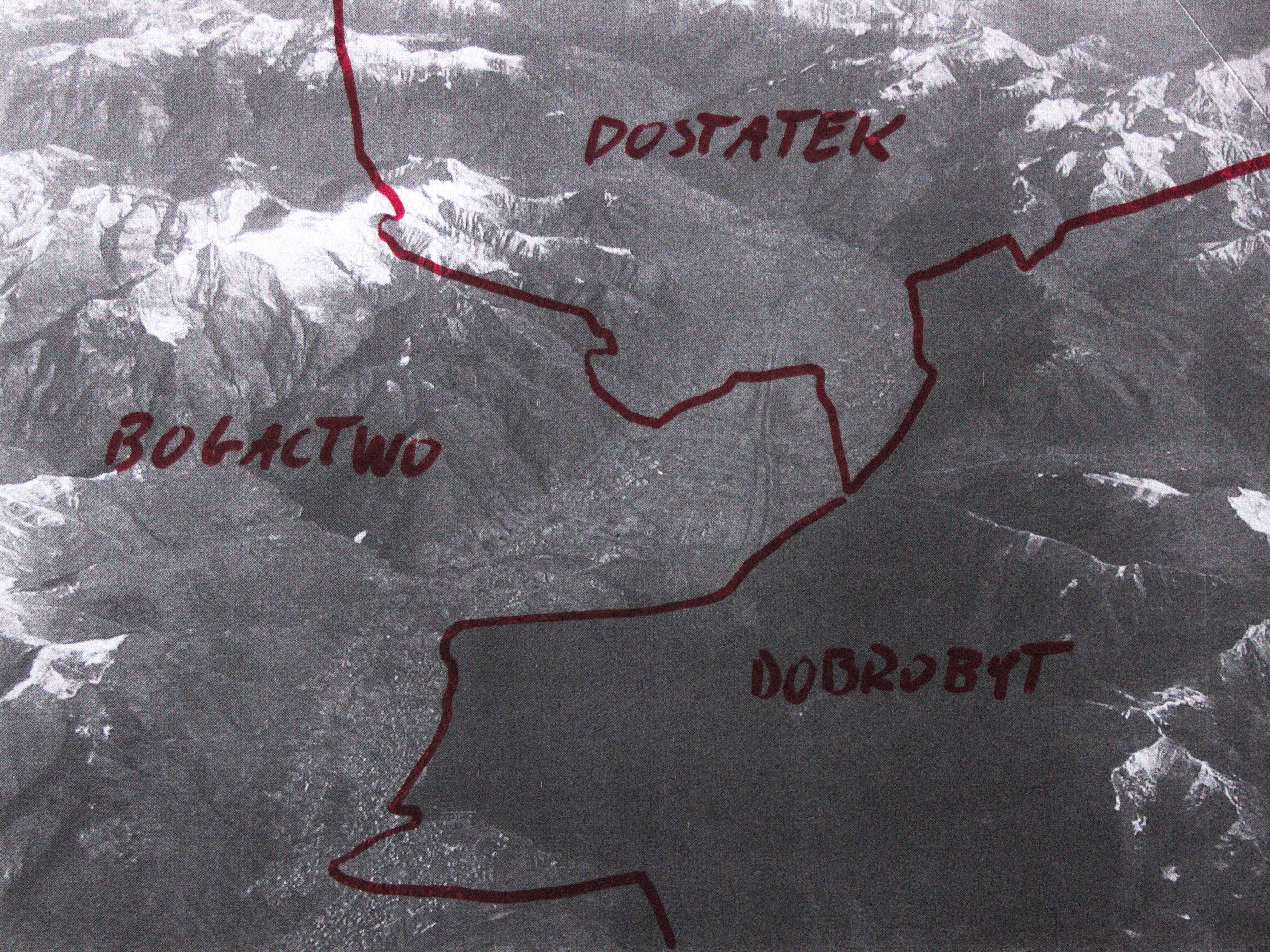 By annotating black-and-white aerial landscape photographs using a marker—drawing lines which divided and marked certain areas artificially and arbitrarily—I created a series of several dozen quasi-maps, showing fictional, hypothetical situations set in an undefined time and in an undefined place. The visual language of maps that I used to this end, being a universally known and comprehensible language of science, makes the situations I create credible. Thanks to this intervention the depicted events, seemingly absurd, come across as realistic scenarios.